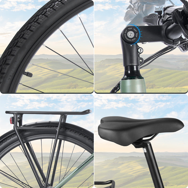 Confident Ride: KENDA 700C tires, ergonomic leather saddle, and adjustable stem ensure grip, posture, and comfort for all-day riding.